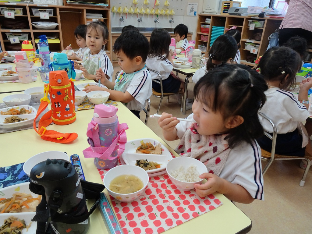 すずらん組さんはのりを使ってお弁当を制作しました。まずはお弁当の具材の買い物に出かけましたよ。ハンバーグにオムレツ、デザートのオレンジと、美味しそうなものがいっぱい!好みの具材を選んだ後は、可愛い動物のお弁当箱にはみ出さないよう具材をのり付けました。ついに完成すると、みんなで拍手をして喜びましたよ。大満足のすずらん組さんでした。