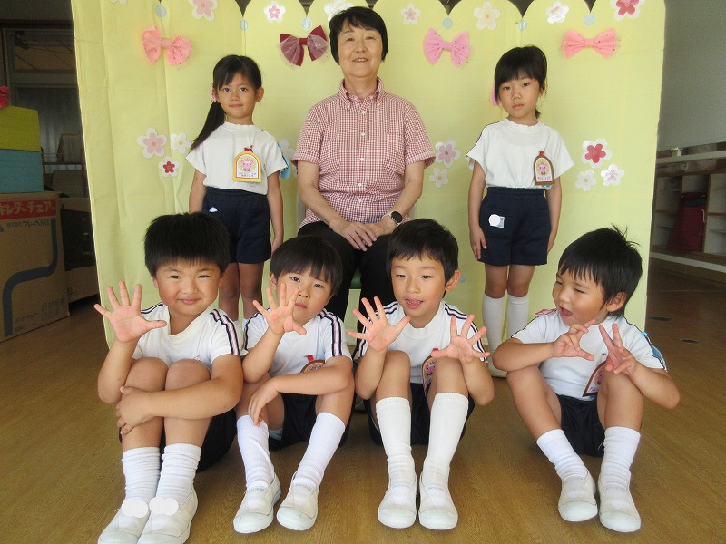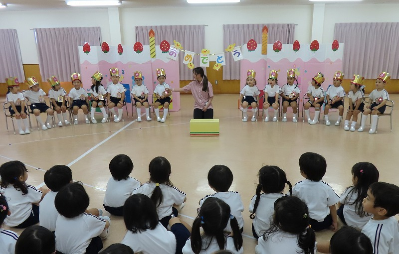 園長先生からキラキラのワッペンを付けてもらった年中さん。とても嬉しそうですね♪今日は6人のお友達を皆でお祝いしましたよ!出し物は、ネズミの嫁入りのうちわシアターでした。かわいいうちわのお話に釘付けの子供達でした。