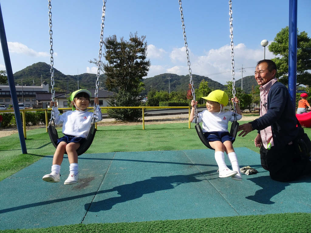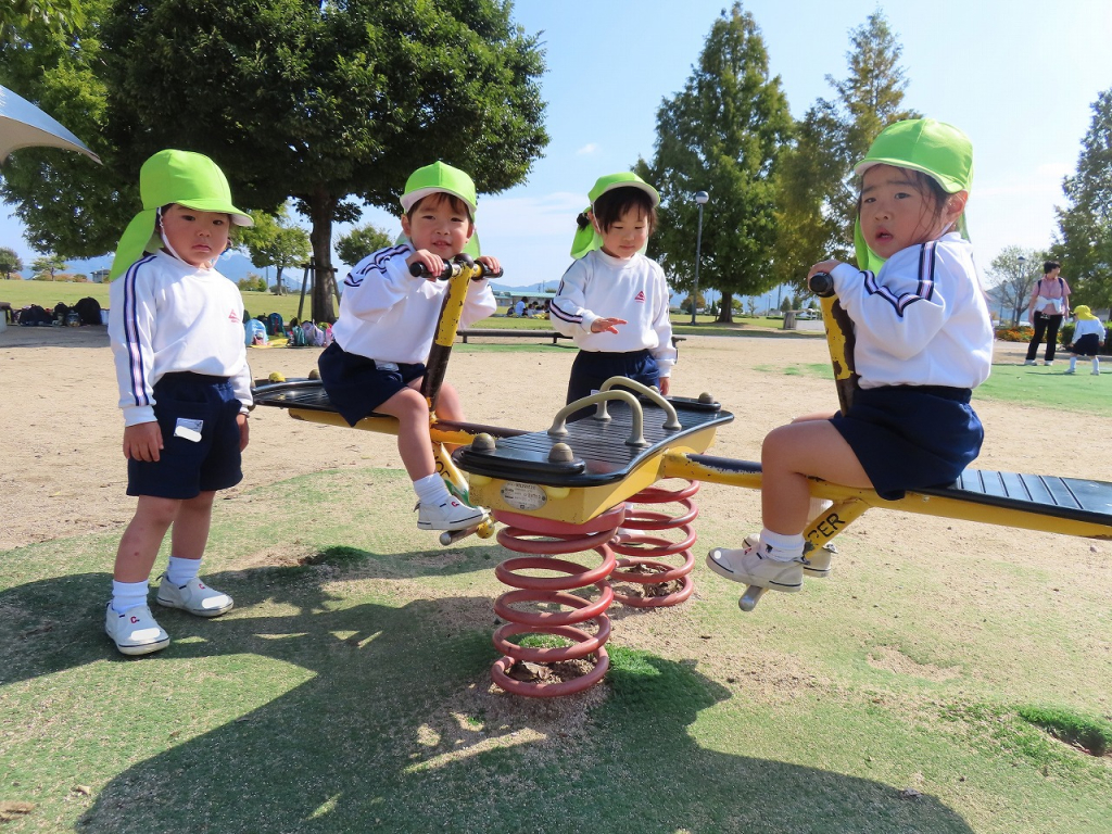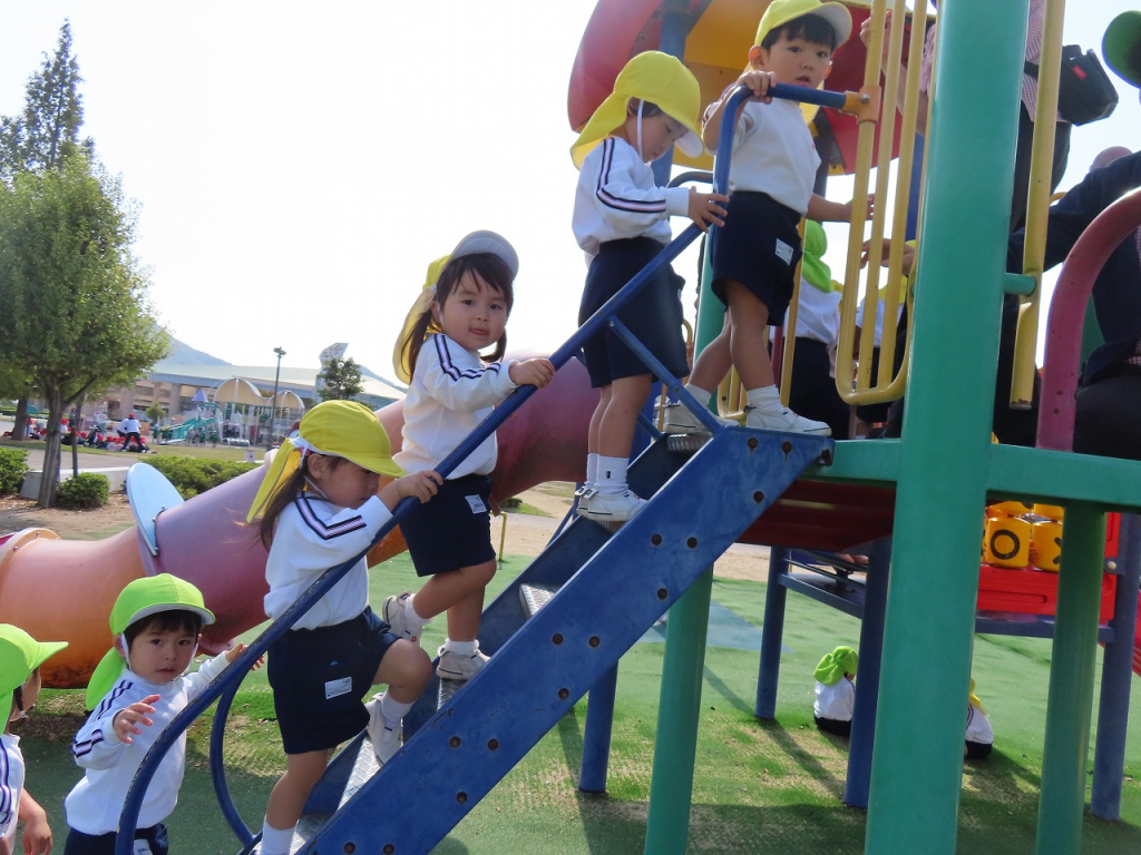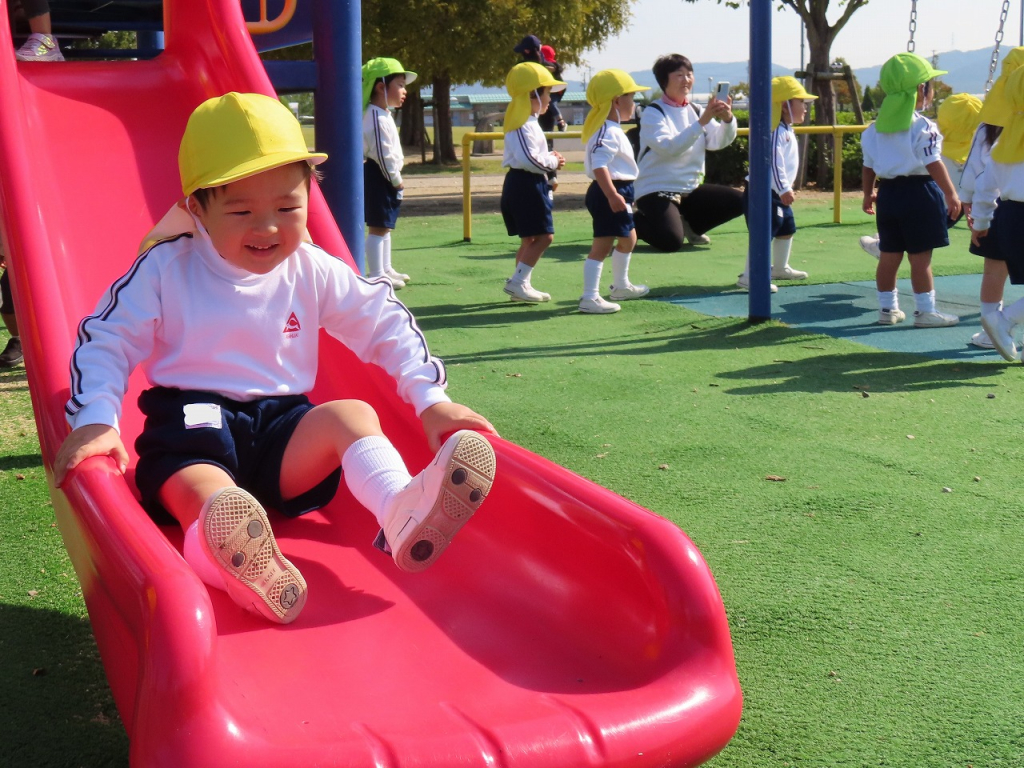 園ブログ 園全体 2025.10.27 2歳遠足(灘崎町総合公園) 今日は、灘崎町総合公園へ遠足に行きました。バスの中では、赤や黄に色づく木々の様子を眺めたり、2歳さんの興味のある働く車(ダンプカー・カーキャリア・パネルバン等)を見つけたりして、大喜びでした。 現地に到着し、記念撮影後は小さい友達用の遊具で満喫!今日は幼児団体の利用が多い日でしたが、順番を待ったり譲り合ったりして公共のマナーを守り、仲良く遊ぶことができましたよ。どの友達も『思いやりのある人』でした。 子供達の人気の遊具は、断然すべり台!3つあるすべり台のどれをすべろうかと悩む姿が可愛かったです。滑り終わると「もう一回!!」と挑戦する様子があり、何度も繰り返して遊びましたよ。 ブランコはやりたい友達が多く、「いち、に、さん・・・」と10まで数えて交代していました。第二園舎にはない遊具なので、ふわっとする感覚を味わい、先生と一緒に大笑いしながら乗っていました。 シーソーのような乗り物にもチャレンジ!初めは乗り方がよく分からない子供達でしたが、だんだんとコツがわかり、友達と勢いよく動かすと楽しいことが分かってきました。「次はそっちに乗る」と乗る場所も交代して、乗り心地を確かめる姿もありましたよ。みんな『バランスのとれた人』でした。 あっという間に帰る時間になり、名残惜しそうな子供達も、バスに乗るとまたテンションが上がる上がる!帰りのバスは、「はたらくくるま」の歌を元気よく歌って過ごしました。楽しい一日を過ごすことができましたね。 一覧へ戻る