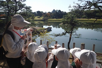 今回の園外保育では、シールラリーも行いました。松の木に巻かれているこも巻きや灯篭、岡山城などを探しました。自分たちで見つけては「先生、みて!あったよ!」と大興奮でした。シールが溜まっていく度に、「あと2つになったね」「もう4つも見つけたね」など楽しみながら、後楽園を散策しました。