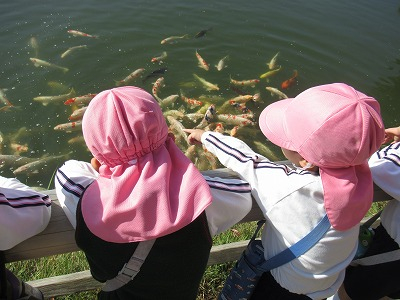 コイの餌やりでは、「食べるときどんな音がするのかな」と耳を澄ませて聞いてみたり、「どんな色のコイがいるのかな」と隅々まで見渡してみたりして、探究する人になれましたね。