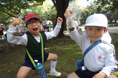 紅葉した落ち葉やいろいろな大きさのどんぐりを見つけて、たくさんの秋を袋いっぱいに詰め、楽しい思い出になりましたね!