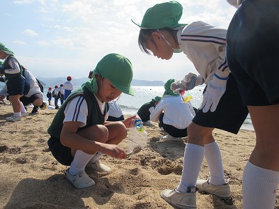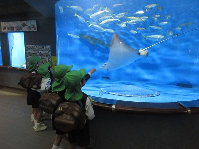今日は、雨で延期になっていた遠足に出かけました。今日の日を楽しみしていた子供達。バスの中では、一日の予定を聞いたり、海の生き物についての話を聞き、窓の外の景色を眺めながら到着を心待ちにしています。水族館に到着してからは、館内のいろいろな場所を見て回ります。玄関に入ってすぐの水槽には、ウミガメがいました。先生が餌やりをするところを見たり、大きな体に興味津々でしたよ。