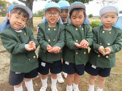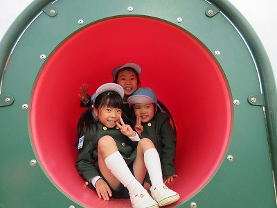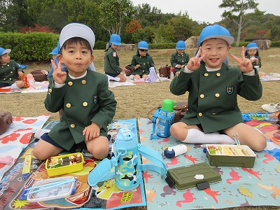 今日はバスに乗り、日応寺自然の森スポーツ広場へ園外保育に出かけました。ちょっぴり長い時間でしたが、バスの中では飛行機の話を聞いたり、外の景色を見たりしながらわくわく向かいました。バスが到着すると早速、飛行機が一機離陸し、間近で見る飛行機に大歓声の年中さんでした。クラス毎、時計台の前で記念撮影をしましたよ(^^)v
