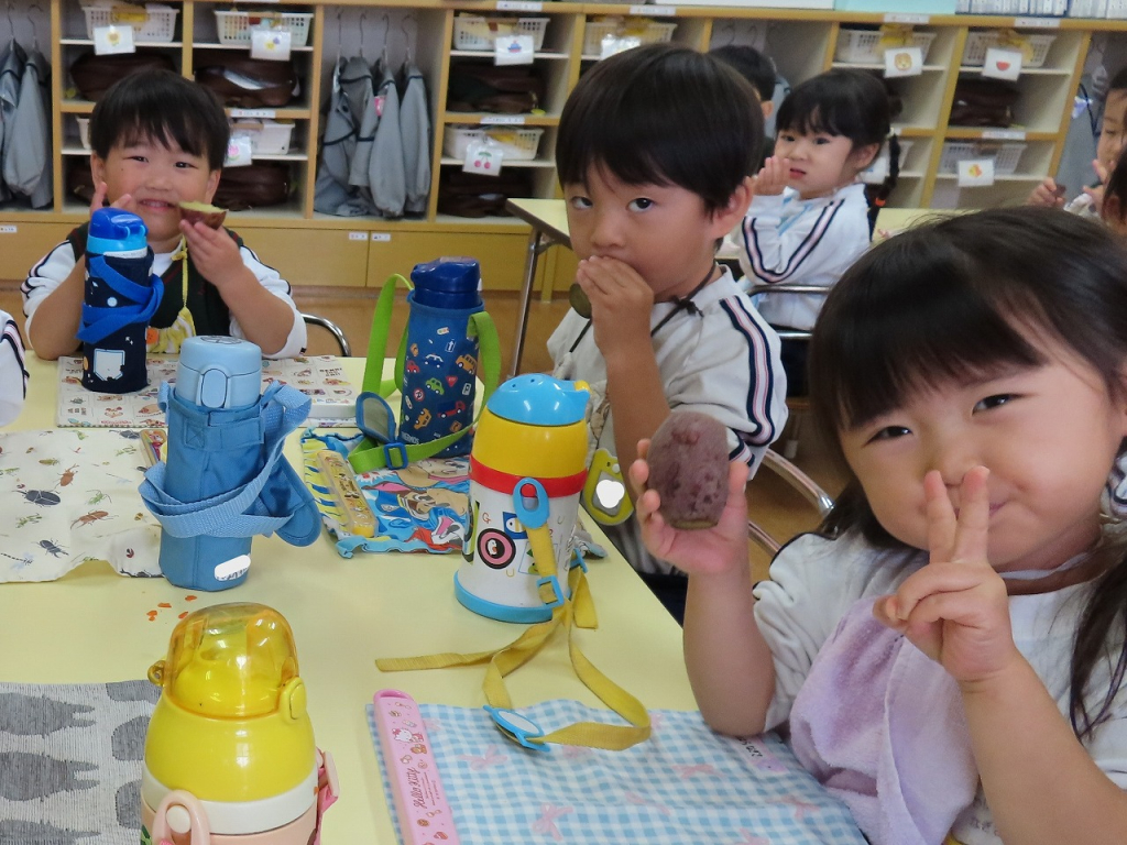 園ブログ 園全体 2025.11.18 今日の2歳児 先日、岡山県総合グラウンドにドングリを拾いに行った2歳さんは、ドングリを使った遊びがお気に入りです。今日はドングリを使ってままごと遊びをしました。完成したご飯を「いただきます」とむしゃむしゃ!美味しいご飯ができたかな? 戸外に出ると、年中さんも園庭で遊んでいました。お兄さんやお姉さんを見つけ、手を繋いでもらって嬉しそう!同じ園舎で過ごしていると、異年齢との関わりが見られて微笑ましいです。 今日は食後に、子供達が掘ったサツマイモを食べました。一口食べると「おいしい」「あまい」と感想を教えてくれましたよ。秋の実りを楽しんだ一日でした。 一覧へ戻る