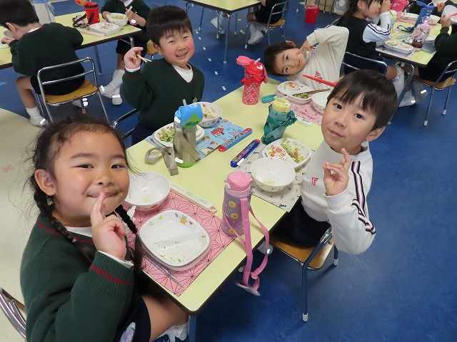 園ブログ 園全体 2026.01.13 今日の年少組 朝の自由遊びでかるたをする子供達。「お家でやったことある」「おじいちゃんとしたよ」と喜んで遊びました。ルールを理解しており、友達同士で読み合いながら、お正月気分で伸び伸びと朝を過ごしました。 ばら組では知育がありました。台形や三角形などの様々な形の色板を使って、六角形や魚の形を作りました。想像力豊かな子供達は、集中して黙々と取り組んでいましたよ。 クリス先生の英語では、初めて年少組みんなで合わせて練習しました。身振りをしながら発音することが難しい様子もありましたが、単語と動作を合わせて発音できるようクラスでも取り組んでいきたいと思います。 今日のメニューは、ちゃんぽんめん・豆サラダ・リンゴゼリーです。苦手な食べ物にも、自分で少しずつ食べ進めようとする姿が見られている年少さん。いろんなメニューにチャレンジする中で、食べてみると「おいしい!」と気付いて完食することもありますよ♪様々な場面で 挑戦する人 になりたいですね! 一覧へ戻る