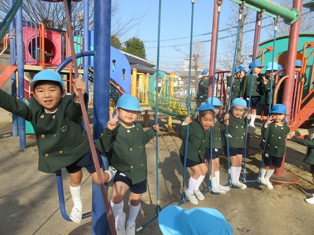 年中さんは、園から歩いて20分の、当新田公園へ行ってきました。近所の方と挨拶を交わしたり、周りの風景を見たりしながら、交通ルールを守って安全に行って帰ることができました。当新田公園では、友達と関わりながら大きな遊具でのびのびと身体を動かしたり、園から持って行った長縄やクルクルボールで遊んだりしました。帰りには「また来たいなぁ」「楽しかった~!」と、久しぶりの友達との戸外遊びを満喫したようでした。