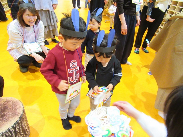 はらぺこあおむしのパズルを見つけてカードにシールを貼り全部出来たらゴール!!可愛らしいペロペロキャンディーのお土産を貰いました。色々なお部屋ではお兄さん、お姉さんが楽しそうに過ごしている様子も見ることが出来ました。