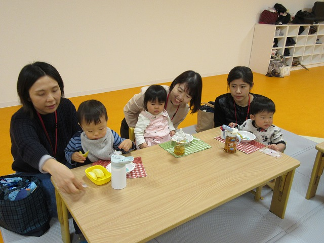 お楽しみのおやつの時間です。0歳さんも離乳食も順調に進んで完了期に入り食べられる物も増えてきたようです。