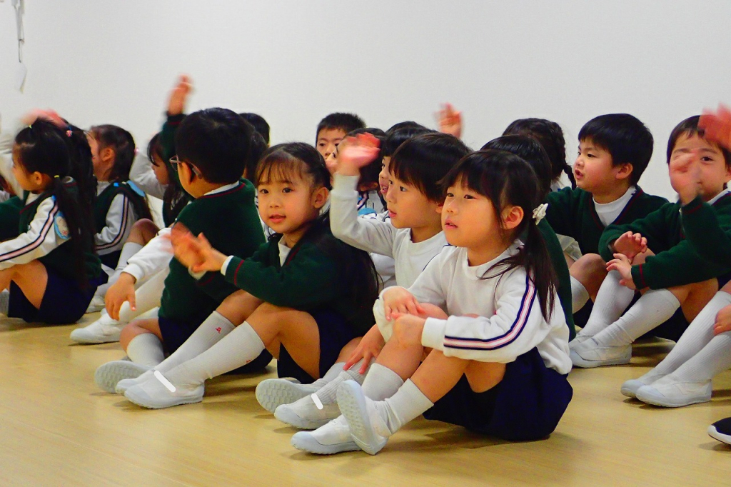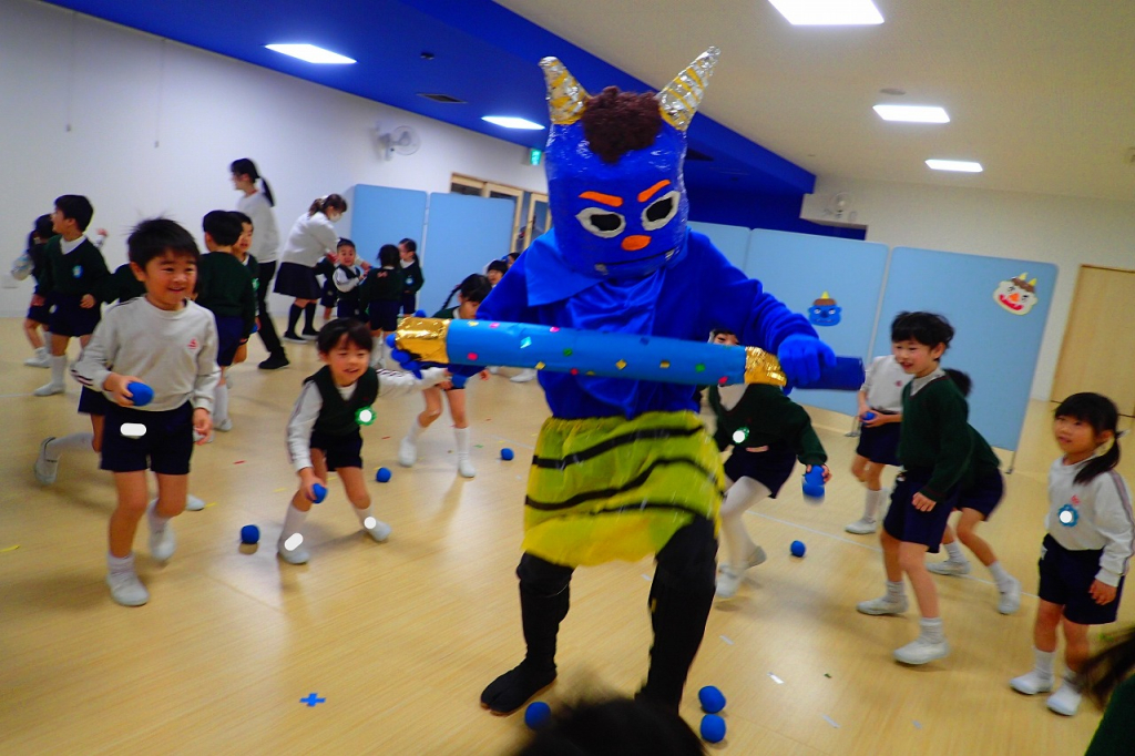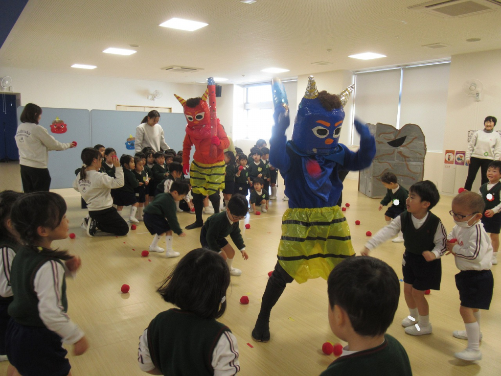 後半は、年中さんと年長さんの節分会です。鬼のパンツの曲がかかると、先生と一緒に元気いっぱい歌う子供達。始まる前から鬼退治にやる気満々です。節分の由来などの話では、とてもいい姿勢で聞くことができていました。「鬼は外!福は内!」の掛け声の練習では、びっくりするほど大きな声でしたよ。