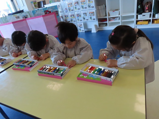 ひな人形の制作では、作る前にひな祭りの絵本を見て、お雛様やお内裏様を思い浮かべながら可愛らしい顔を描くことができました。お雛様が乗っている親王台は好きな色を手にとり、思い思いに塗りそれぞれ素敵な親王台が出来上がりました。