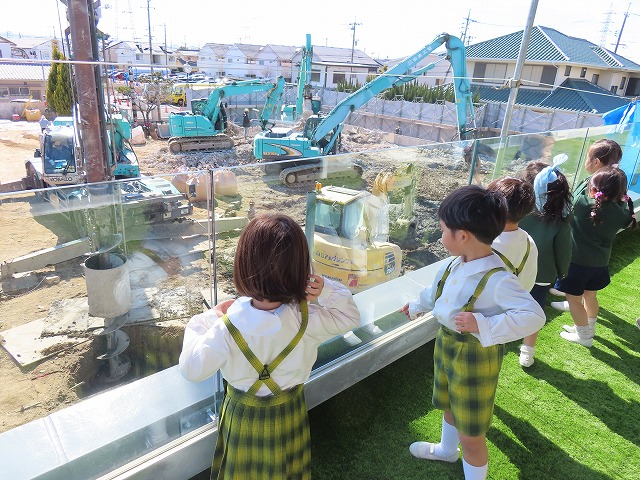 毎日隣で工事をしている様子を気にしている子供達は、「階段がなくなったね」「クレーン車が動いているね」など楽しく観察しています。テラスに出て間近で観察することができて、大盛り上がりでした!土を掘る大きな機械を見て「あれはなんだろう」と探究しようとする姿もみられました。
