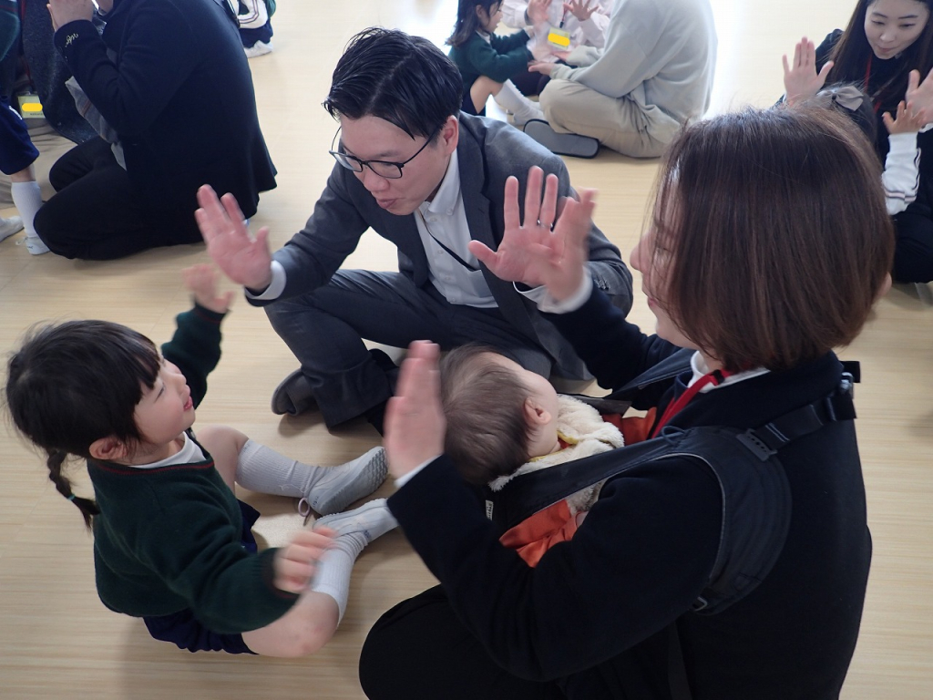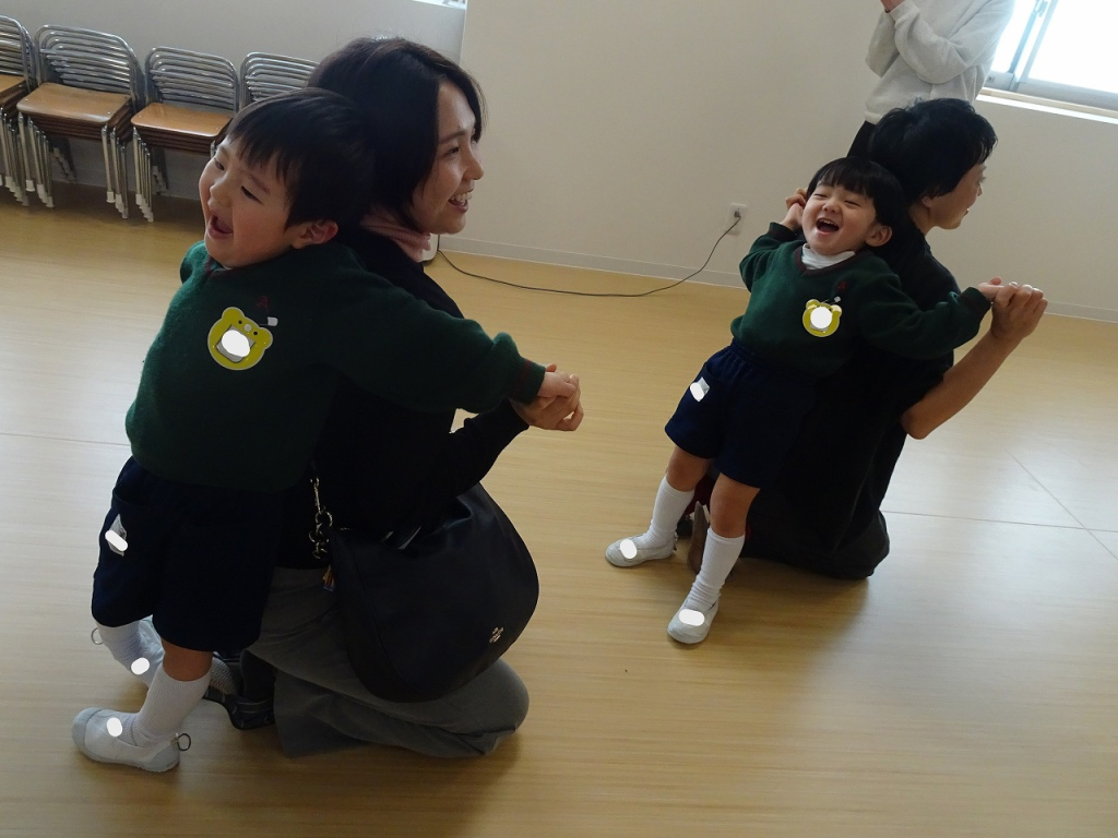 ホールではふれあい遊びをしました。「しあわせなら手をたたこう」を保護者の方と向かい合ってしましたよ。お互いに手と手を合わせて叩いたり、肩をたたいたり、ほっぺをツンツンしたり...最後にはギューッとしてもらって、温かい気持ちになりましたね。