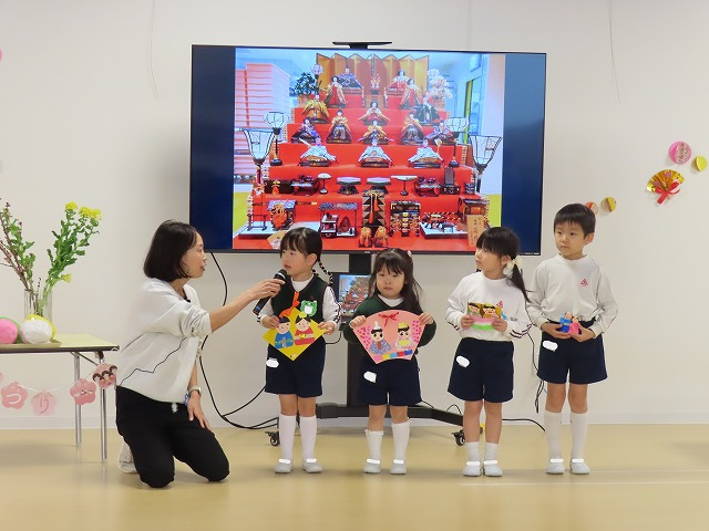 今日は3月3日、ひなまつりの日です。幼稚園でもひなまつりがありましたよ。大きなモニターには玄関に飾ってある7段飾りが映し出されました。園長先生の話を聞いた後は、ひなまつりの由来を聞いたり、ひなまつりの日に食べるものの話を聞き、知識のある人になりました。