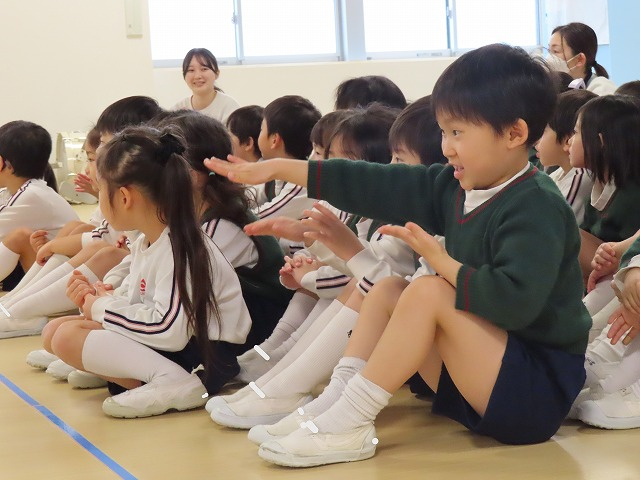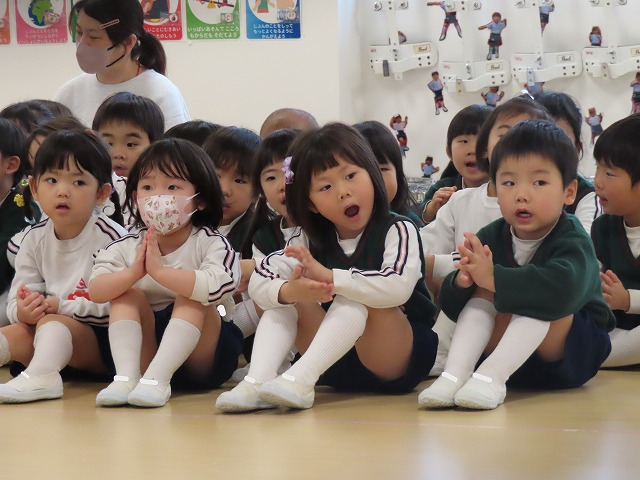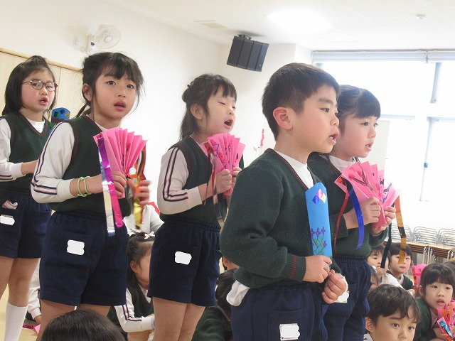 2歳さんから年長さんの順番に制作したお雛様の紹介をしました。自分の名前や作るときに頑張ったところをドキドキしながらも上手に発表することができました。目を描くところや絵具を使ったこと、シールを貼ったことなど、たくさん教えてくれました。発表が終わるとお友達からたくさんの拍手をもらって、嬉しそうな子どもたちでした。