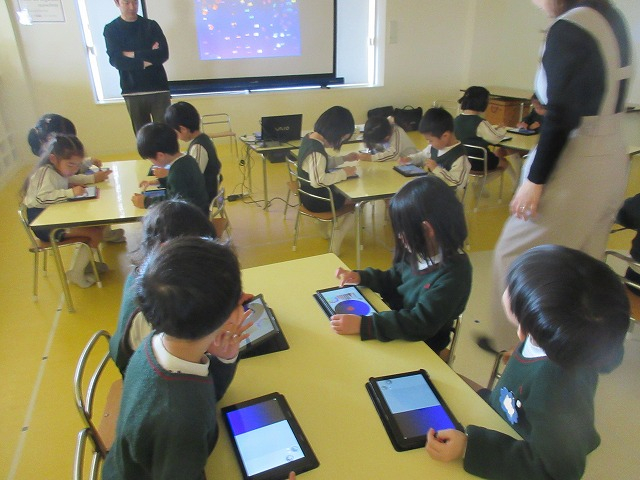 次は、魚の絵を描いてそれを大きなスクリーンに映し出す方法を教えてもらいました。自分が描いた魚が移ると、とても嬉しそう!皆の描いた海の生き物が、スクリーンいっぱい映り、水族館のようでした。年長さんになったらタブレットを使い、もっと色々なことに挑戦しますよ。楽しみですね!