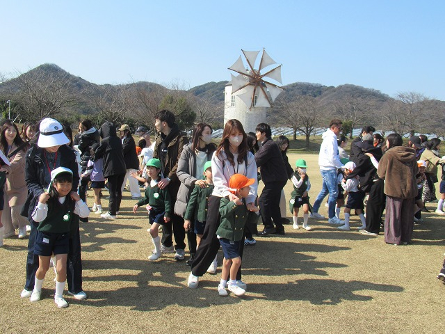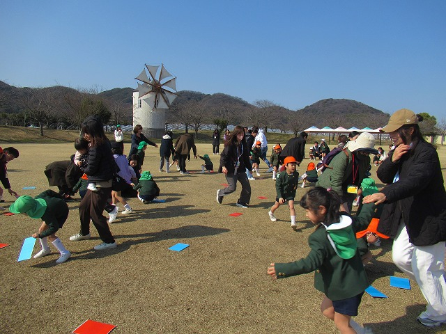 2つ目のゲームは、お家の方とペアでじゃんけん列車を楽しみました。何度もやったことのあるゲームですが、お家の方と一緒でいつも以上に笑顔のあふれる子供達。ジャンケンの時には、勝敗が決まるたびに嬉しそうな声が響いていましたよ。