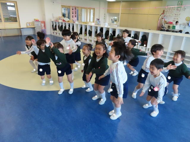 れんげ組は「こんなこと こんなこと できますか?」という真似っこゲームや、じゃんけんれっしゃをしました。真似っこゲームで子供達にお手本役を任せると、それぞれ面白い動きを考えてくれて、みんなで大笑いしながら楽しみましたよ♪