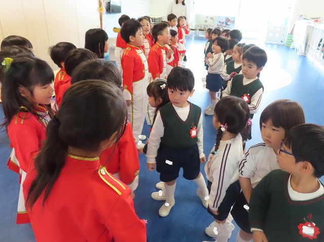 年長さんが、各クラスを回ってご挨拶に来てくれました。「年中さんになっても頑張ってね!」とエールをもらい、最後には握手をしたりハグをしたりと、最後のふれあいをしました。「小学校に行っても頑張ってね!」と年少さんも元気に挨拶することができました。