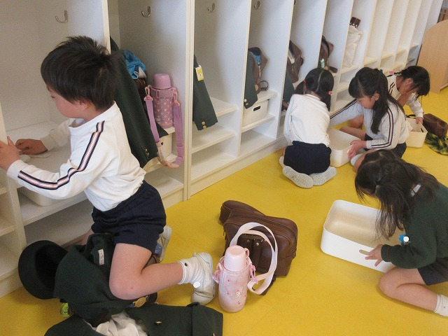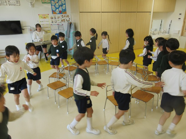 あやめ組では、椅子取りゲームをして大盛り上がりです!座れなくても友達に「がんばれー!」と応援する姿が格好良かったですよ。すみれ組ではハンカチ落としをしました。走るスピードも速くなり、追いつかれそうな場面にハラハラドキドキです!どちらのクラスも、友達と関わりながら楽しい時間を過ごすことができました。