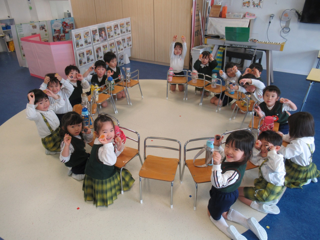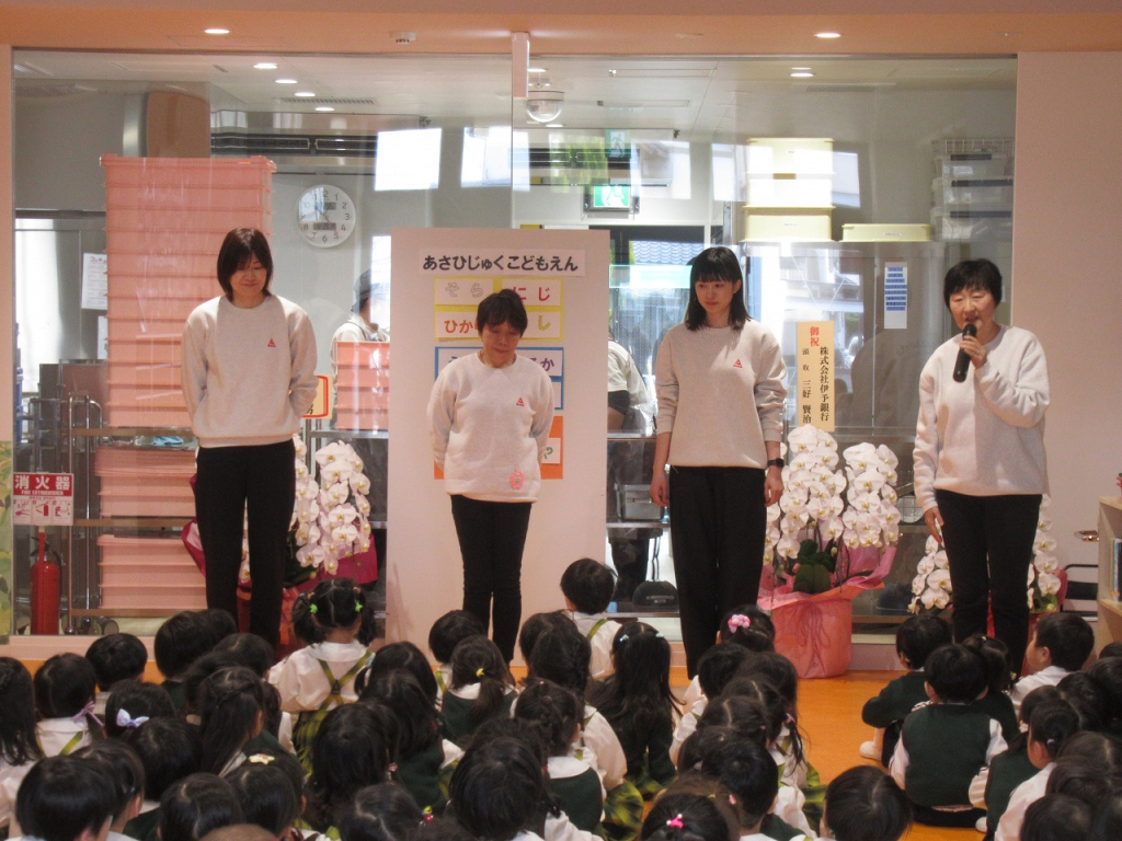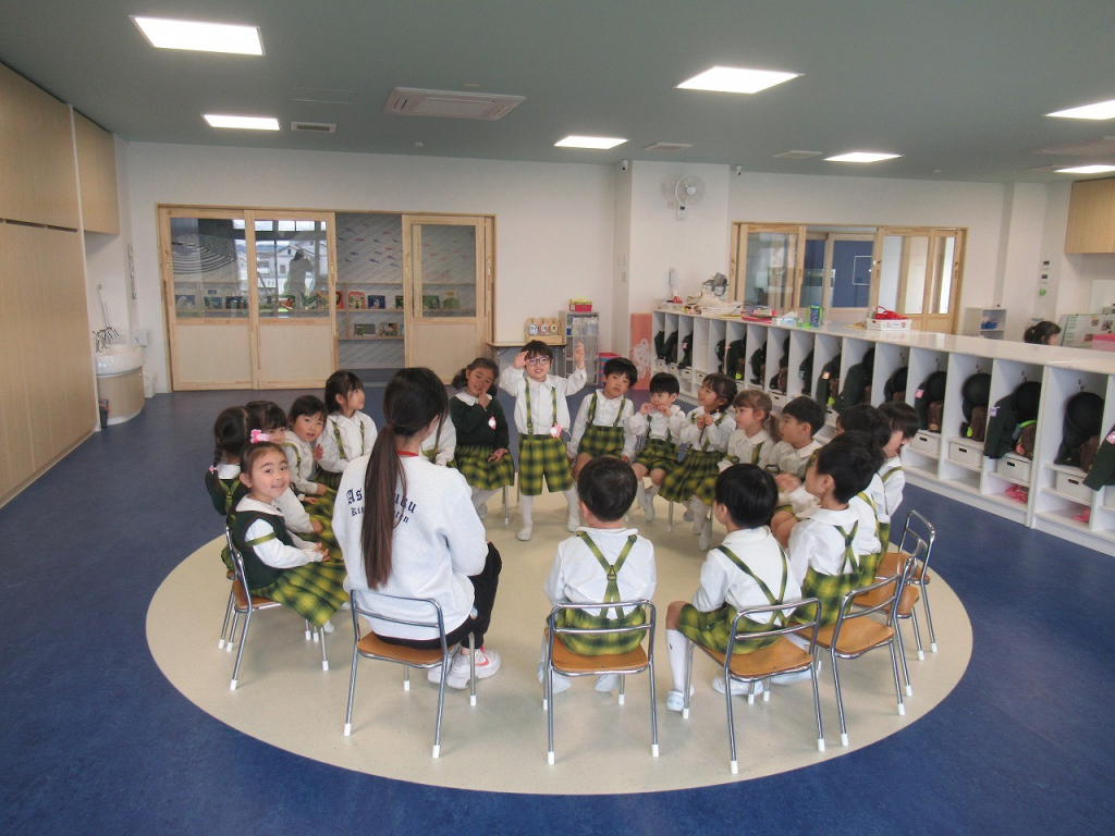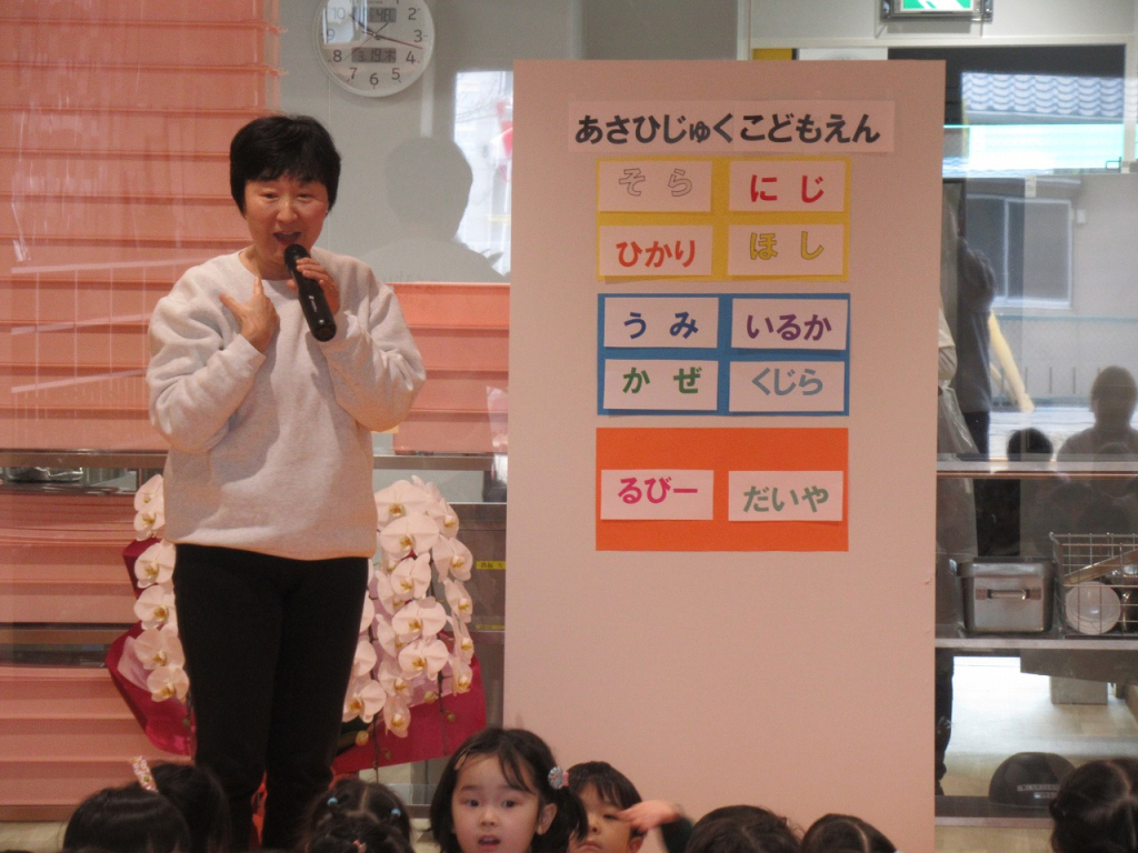 園長先生のお話では、新しいクラスの名前についてお話を聞きました。来年度からは、年長『そら組・ひかり組』年中『にじ組・ほし組』年少『うみ組・かぜ組』2歳『いるか組・くじら組』1歳『るびー組』0歳『だいや組』のクラスの名前になります。そして、「朝日塾幼稚園から朝日塾こども園へ変わるんだよ」と園長先生に教えてもらいました。
