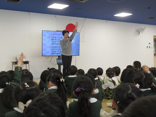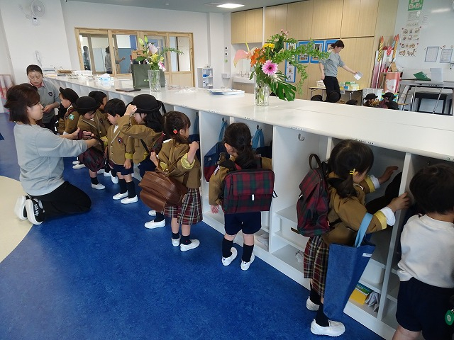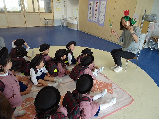 園ブログ 園全体 2026.04.06 令和8年度 始業式 今日は令和8年度の始業式でした。新しいクラスを心待ちに登園してきた子供達。久しぶりに会う先生に笑顔で挨拶できていましたよ。先生に声をかけてもらいながら嬉しそうにお部屋に行くことができていました。年少さん・年中さん・年長さんは始業式に参加しました。 新しいクラスの名前を呼んでもらったり、新しいクラスカラーを教えてもらったりと変わった所をみんなで話しました。今日から、新しいクラスでたくさんの友達と楽しく過ごしましょうね。 1歳さんは少しずつ園にも慣れ笑顔で過ごすことができるようになっています。先生に「いないいない…」と声をかけてもらうと、「ばぁ!」と笑顔で楽しむ姿が見られています。 2歳さんのお部屋では、先生と一緒に「チューリップ」の歌を楽しんでいました。先生の話を聞きながら、「はーい」と元気に手を挙げてくれるお友達もいましたよ。少しずつ園に慣れていきましょうね。 年少さんは、自分のロッカーから服を取って着替えたり、帰りの用意を頑張っていました。新しい制服や帽子もとてもうれしそうです。新しい先生やお友達にも少しずつ慣れていってくれるといいですね。また、明日も元気に来てください。先生達も楽しみに待っていますよ。 一覧へ戻る