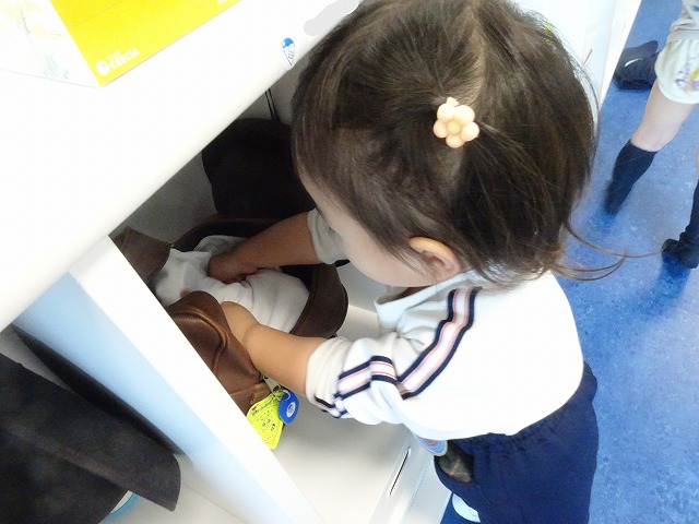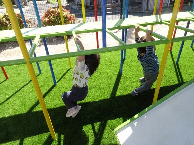 1歳児クラスのルビー組さんは、初めて園庭の遊具で遊びました。滑り台を滑ったり、雲梯にぶら下がったりと興味津々です。ハイハイをしているお友達も人工芝の上で日向ぼっこを楽しみました。いいお天気で気持ちいいね。