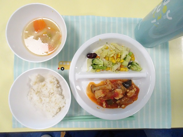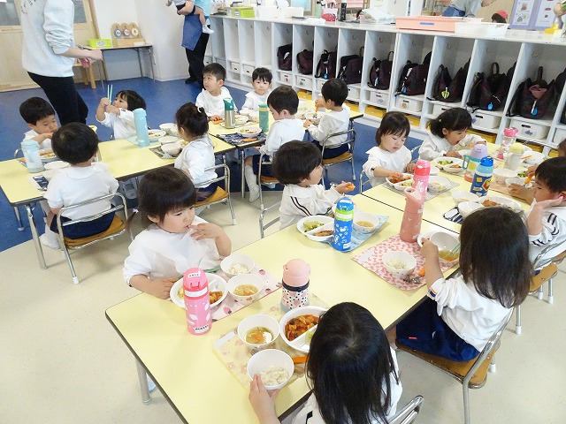 今日から給食が始まりました。2歳児さんは自分でランチマットや水筒を用意していました。みんなでご挨拶をしてパクパク食べています。「これなあに?」「おいしいね」とみんな笑顔で食べることができていましたよ。